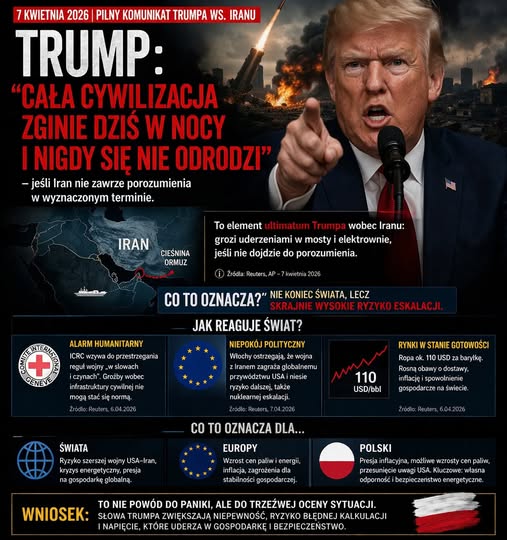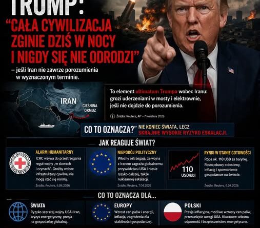 To nie jest jeszcze zapowiedź „końca świata”, ale jest to sygnał bardzo groźnej fazy kryzysu. Gdy przywódca największego mocarstwa stawia ultimatum i używa tak skrajnych sformułowań, rośnie ryzyko błędnej kalkulacji, dalszej eskalacji i chaosu politycznego.