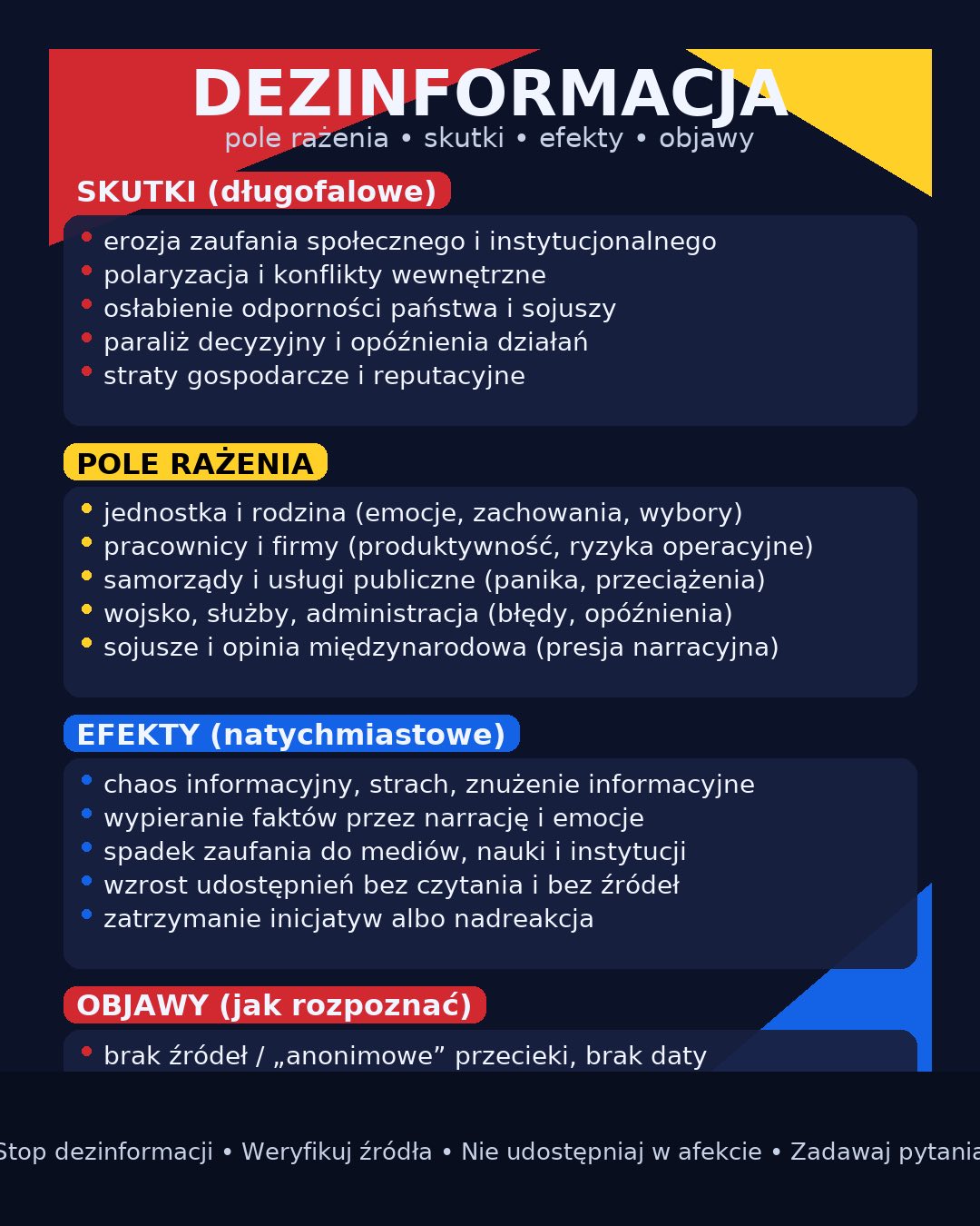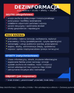 Zagrożenie dezinformacją to dziś broń ofensywna: uderza w zaufanie społeczne, paraliżuje decyzje, osłabia morale, wywołuje chaos i koszty dla państwa, samorządów i firm. W realiach „przedwojnia” przewaga informacyjna jest częścią obrony.